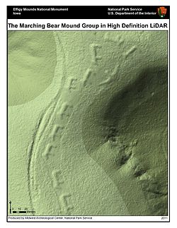 Lidar can also help to create high-resolution digital elevation models (DEMs) of archaeological sites that can reveal micro-topography that is otherwise hidden by vegetation. The intensity of the returned lidar signal can be used to detect features buried under flat vegetated surfaces such as fields, especially when mapping using the infrared spectrum. The presence of these features affects plant growth and thus the amount of infrared light reflected back.[63] For example, at Fort Beauséjour – Fort Cumberland National Historic Site, Canada, lidar discovered archaeological features related to the siege of the Fort in 1755. Features that could not be distinguished on the ground or through aerial photography were identified by overlaying hill shades of the DEM created with artificial illumination from various angles. Another example is work at Caracol by Arlen Chase and his wife Diane Zaino Chase.[64] In 2012, lidar was used to search for the legendary city of La Ciudad Blanca or "City of the Monkey God" in the La Mosquitia region of the Honduran jungle. During a seven-day mapping period, evidence was found of man-made structures.[65][66] In June 2013, the rediscovery of the city of Mahendraparvata was announced.[67] In southern New England, lidar was used to reveal stone walls, building foundations, abandoned roads, and other landscape features obscured in aerial photography by the region's dense forest canopy.[68][69][70] In Cambodia, lidar data was used by Damian Evans and Roland Fletcher to reveal anthropogenic changes to Angkor landscape.[71]