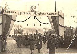 In 1918–1920 Lithuanians defended the statehood of Lithuania against Bolsheviks, Bermontians and Poles during the Lithuanian Wars of Independence.[68] The aims of the newly restored Lithuania clashed with Józef Piłsudski's plans to create a federation (Intermarium) in territories previously ruled by the Jagiellonians.[69] The Lithuanian authorities prevented the 1919 Polish coup attempt in Lithuania, and in 1920 during the Żeligowski's Mutiny the Polish forces captured Vilnius Region and established a puppet state of the Republic of Central Lithuania, which in 1922 was incorporated into Poland.[68] Consequently, Kaunas became the temporary capital of Lithuania where the Constituent Assembly of Lithuania was held and other primary Lithuanian institutions operated until 1940.[70] In 1923, the Klaipėda Revolt was organized which unified the Klaipėda Region with Lithuania.[71] The 1926 Lithuanian coup d'état replaced the democratically elected government and president with an authoritarian regime led by Antanas Smetona.[71]