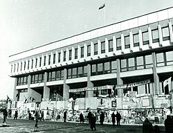 Gradually, economic relations were restored. However, tensions peaked again in January 1991. Attempts were made to carry out a coup using the Soviet Armed Forces, the Internal Army of the Ministry of Internal Affairs and the USSR Committee for State Security (KGB). Because of the poor economic situation in Lithuania, the forces in Moscow thought the coup d'état would receive strong public support.[79] People flooded to Vilnius to defend the Supreme Council of the Republic of Lithuania and independence. The coup ended with a few casualties and material loss. The Soviet Army killed 14 people and injured hundreds. A large part of the Lithuanian population participated in the January Events.[80][81][78] On 31 July 1991, Soviet paramilitaries killed 7 Lithuanian border guards on the Belarusian border in what became known as the Medininkai Massacre.[78] On 17 September, Lithuania was admitted to the United Nations.[78]