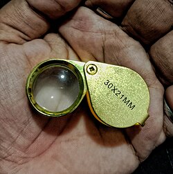 A loupe (/ˈluːp/ LOOP) is a simple, small magnification device used to see small details more closely.[1] They generally have higher magnification than a magnifying glass, and are designed to be held or worn close to the eye. A loupe does not have an attached handle, and its focusing lens(es) are contained in an opaque cylinder or cone. On some loupes this cylinder folds into an enclosing housing that protects the lenses when not in use.