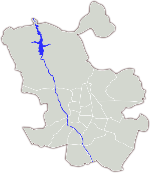 The oldest urban core is located on the hills next to the left bank of the Manzanares River.[93] Madrid grew to the east, reaching the Fuente Castellana Creek, now the Paseo de la Castellana, and further east reaching the Abroñigal Creek, now the M-30.[93] Madrid also grew through the annexation of neighbouring urban settlements,[93] including those to the South West on the right bank of the Manzanares.