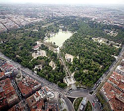 El Retiro is the most visited location of the city.[96] Having an area bigger than 1.4 km2 (0.5 sq mi) (350 acres), it is the largest park within the Almendra Central, the inner part of the city enclosed by the M-30. Created during the reign of Philip IV (17th century), it was handed over to the municipality in 1868, after the Glorious Revolution.[97][98] It lies next to the Royal Botanical Garden of Madrid.