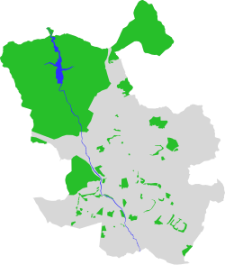 The Monte de El Pardo, a protected forested area covering over a quarter of the municipality, reaches its top altitude (843 m (2,766 ft)) on its perimeter, in the slopes surrounding El Pardo reservoir located at the north-western end of the municipality, in the Fuencarral-El Pardo district.[92]