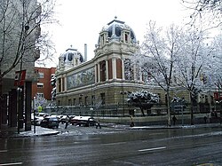 Madrid was invaded on 24 May 1823 by a French army—the so-called Hundred Thousand Sons of Saint Louis—called to intervene to restore the absolutism of Ferdinand that the latter had been deprived from during the 1820–1823 trienio liberal.[60] Unlike other European capitals, during the first half of the 19th century the only noticeable bourgeois elements in Madrid (that experienced a delay in its industrial development up to that point) were merchants.[61] The University of Alcalá de Henares was relocated to Madrid in 1836, becoming the Central University.[62]