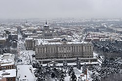 The highest recorded temperature in central Madrid's Retiro Park was on 14 August 2021, with 40.7 °C (105.3 °F). The lowest recorded temperature was on 16 January 1945 with −10.1 °C (13.8 °F) in Madrid.[106] At the airport, on the eastern side of Madrid, the highest recorded temperature was on 14 August 2021, at 42.7 °C (108.9 °F). The lowest recorded temperature was on 16 January 1945 at −15.2 °C (4.6 °F).[107] From 7 to 9 January 2021, Madrid received the most snow in its recorded history since 1904; Spain's meteorological agency AEMET reported between 50 and 60 cm (20 and 24 in) of accumulated snow in its weather stations within the city.[108]