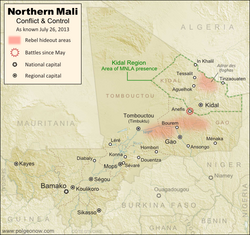 [edit]The alliance between the Tuareg nationalists and jihadist groups severely damaged the international legitimacy of the broader Tuareg movement. As a result,[39] by December, the now displaced MNLA began peace talks with the Malian government and relinquished its previous goal of Azawadi independence in favor of a request for self-rule within Mali. After the French entry in January 2013, the MNLA spokesman in Paris, Moussa Ag Assarid (who had criticized the splinter group FPA months earlier for giving up on independence[87]) declared that the MNLA was "ready to help" their former opponents in the fight against the Islamists.[99] At that time, the MNLA controlled no big localities and was only strong in rural and desert areas near the borders with Mauritania, Algeria and Niger, having been driven off from most of its claimed territory by Islamist groups.[100] Soon, it would begin to support French and Chadian forces in restoring state authority to the cities in the north and in operations against their mountain strongholds, particularly with intelligence, while still opposing the Malian army.[35]