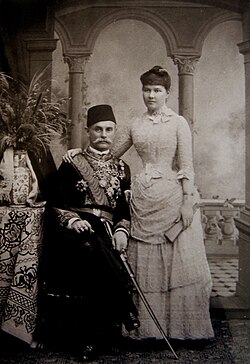 During one of her return visits to Stockholm, she met Prince Jean Karadja Pasha, the Ottoman envoy to The Hague and Stockholm. At the age of nineteen, she married the significantly older Karadja in 1887 in two ceremonies: an Eastern Orthodox ceremony at a Russian church, and a Protestant ceremony at her parents' house. The prince was considerably older than she was.[2][5] Through her marriage, she received the title of princess,[6] also converting to Orthodoxy.[7] Columnist Frederick William Wile (the "Duchese de Belimere") reported in September 1898 that: "The young ladies in Stockholm have all heard their mothers tell how [the Pasha] fell desperately in love with a Swedish girl [...], married her and left for The Hague, where they lived in happiness and peace."[8]