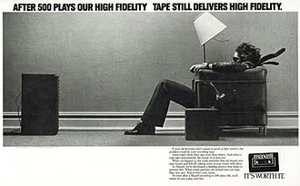 [edit]In the 1980s, Maxell became an icon of pop culture when it produced advertisements popularly known as "Blown Away Guy" for its line of audio cassettes. The campaign began as a two-page advertising spread in Rolling Stone magazine in 1980. The photo shows a man sitting low in a (Le Corbusier Grand Confort LC2[13]) high armed chair (on the right side of the spread) in front of, and facing, a JBL L100 speaker (the left side of the spread). His hair and necktie, along with the lampshade to the man's right and the martini glass on the low table to the man's left, are being blown back by the tremendous sound from speakers in front of him—supposedly due to the audio accuracy of Maxell's product. The man is shown desperately clinging to the armrests but defiantly looking ahead at the source of the music through sunglasses.