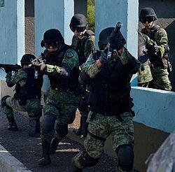 By 2011, the Mexican Armed Forces had captured 11,544 people who were believed to have been involved with the cartels and organized crime.[91] In the year prior, 28,000 individuals were arrested on drug-related charges. In October 2012, Mexican Navy forces killed Heriberto Lazcano, leader of Los Zetas, in a shootout in Sabinas, Coahuila, after gunmen attacked their patrol. The operation came just hours after the capture of another senior Zeta, Salvador Alfonso Martínez Escobedo.[92][93][94][95] Lazcano's death is viewed as the most significant cartel leader killing in Calderón's administration. It strengthened the Navy’s standing, allowed Miguel Treviño Morales to take control of Los Zetas, and ultimately benefited Joaquín “El Chapo” Guzmán, whose Sinaloa Cartel sought to dominate the Nuevo Laredo smuggling routes.[96][97]