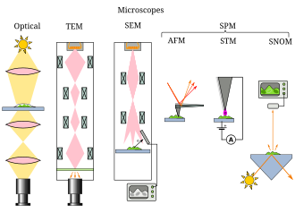 The different types of scanning probe microscopes arise from the many different types of interactions that occur when a small probe is scanned over and interacts with a specimen. These interactions or modes can be recorded or mapped as function of location on the surface to form a characterization map. The three most common types of scanning probe microscopes are atomic force microscopes (AFM), near-field scanning optical microscopes (NSOM or SNOM, scanning near-field optical microscopy), and scanning tunneling microscopes (STM).[28] An atomic force microscope has a fine probe, usually of silicon or silicon nitride, attached to a cantilever; the probe is scanned over the surface of the sample, and the forces that cause an interaction between the probe and the surface of the sample are measured and mapped. A near-field scanning optical microscope is similar to an AFM but its probe consists of a light source in an optical fiber covered with a tip that has usually an aperture for the light to pass through. The microscope can capture either transmitted or reflected light to measure very localized optical properties of the surface, commonly of a biological specimen. Scanning tunneling microscopes have a metal tip with a single apical atom; the tip is attached to a tube through which a current flows.[29] The tip is scanned over the surface of a conductive sample until a tunneling current flows; the current is kept constant by computer movement of the tip and an image is formed by the recorded movements of the tip.[28]