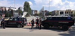 Milošević finally accepted the terms of an international peace plan on 3 June 1999, ending the Kosovo War. On 11 June, Milošević further accepted UN resolution 1244, under the mandate of which NATO then helped establish the KFOR peacekeeping force. Nearly one million refugees had fled Kosovo, and part of KFOR's mandate was to protect the humanitarian missions, in addition to deterring violence.[60] In August–September 2001, the alliance also mounted Operation Essential Harvest, a mission disarming ethnic Albanian militias in the Republic of Macedonia.[61] As of 2023[update], around 4,500 KFOR soldiers, representing 27 countries, continue to operate in the area.[62]