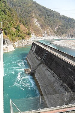 The Indian plate continues to move north relative to Asia at about 50 mm (2.0 in) per year.[93] This makes Nepal an earthquake-prone zone, and periodic earthquakes that have devastating consequences present a significant hurdle to development.[94] Erosion of the Himalayas is a very important source of sediment, which flows to the Indian Ocean.[95] Saptakoshi, in particular, carries a huge amount of silt out of Nepal but sees extreme drop in Gradient in Bihar, causing severe floods and course changes, and is, therefore, known as the sorrow of Bihar. Severe flooding and landslides cause deaths and disease, destroy farmlands and cripple the transport infrastructure of the country, during the monsoon season each year.