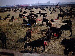 Nepal contains 107 IUCN-designated threatened species, 88 of them animal species, 18 plant species and one species of "fungi or protist" group.[113] These include the endangered Bengal tiger, the red panda, the Asiatic elephant, the Himalayan musk deer, the wild water buffalo and the South Asian river dolphin,[114] as well as the critically endangered gharial, the Bengal florican,[97][115] and the white-rumped vulture, which has become nearly extinct by having ingested the carrion of diclofenac-treated cattle.[116] The pervasive and ecologically devastating human encroachment of recent decades has critically endangered Nepali wildlife. In response, the system of national parks and protected areas, first established in 1973 with the enactment of National Parks and Wildlife Conservation Act 1973,[117] was substantially expanded. Vulture restaurants[98] coupled with a ban on veterinary usage of diclofenac has seen a rise in the number of white-rumped vultures.[118][116] The community forestry programme which has seen a third of the country's population directly participate in managing a quarter of the total forested area has helped the local economies while reducing human-wildlife conflict.[119][120] The breeding programmes[121] coupled with community-assisted military patrols,[122] and a crackdown on poaching and smuggling, has seen poaching of critically endangered tigers and elephants as well as vulnerable rhinos, among others, go down to effectively zero, and their numbers have steadily increased.[123] Nepal has ten national parks, three wildlife reserves, one hunting reserve, three Conservation Areas and eleven buffer zones, covering a total area of 28,959.67 km2 (11,181.39 sq mi), or 19.67% of the total land area,[124] while ten wetlands are registered under the Ramsar Convention.[125] Nepal has consistently been ranked as one of the most polluted countries in the world.[126]