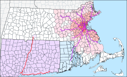 New England is geologically a part of the New England province, an exotic terrane region consisting of the Appalachian Mountains, the New England highlands and the seaboard lowlands.[70] The Appalachian Mountains roughly follow the border between New England and New York. The Berkshires in Massachusetts and Connecticut, and the Green Mountains in Vermont, as well as the Taconic Mountains, form a spine of Precambrian rock.[71]