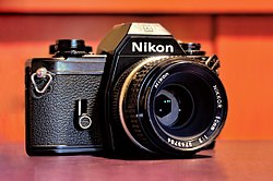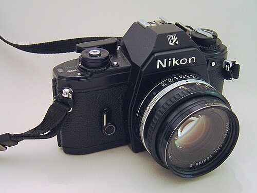 The Nikon EM is a beginner's level, interchangeable lens, 35 mm film, single lens reflex (SLR) camera. It was manufactured by Nippon Kogaku K. K. (today Nikon Corporation) in Japan from 1979 to 1982 (available new from dealer stock until circa 1984). The camera was designed for and marketed to the growing market of new photographers then entering the SLR buyer's market.[1] The EM uses a Seiko MFC-E focal plane shutter with a speed range of 1 to 1/1000 second plus Bulb and flash X-sync of 1/90 second. It is 86 mm (3.4 in) high, 135 mm (5.3 in) wide, 54 mm (2.1 in) deep and weighed 460 grams (16 oz). Unlike most Nikons of the time, it was available only in black. The EM has no full manual exposure mode capability, but instead was intended to be used by inexperienced photographers who could not easily master the intricacies of shutter speeds and f-stops. There were also significant changes to the EM's mechanical and electrical components to reduce its production cost relative to previous Nikon cameras: dimensional tolerances weren't as tight, there were no ball bearings in the film advance mechanism, and no high-quality titanium shutter.[2] The introductory US list price for the body plus normal lens was only $231.[citation needed]