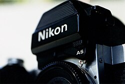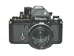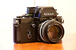 The Nikon F2 is a professional-level, interchangeable lens, 35 mm film, single-lens reflex (SLR) camera. It was manufactured by the Japanese optics company Nippon Kogaku K. K. (Nikon Corporation since 1988) in Japan from September 1971 to 1980.[1] It used a horizontal-travel focal plane shutter with titanium shutter curtains and a speed range of 1 to 1/2000 second (up to 10 seconds using the self-timer) plus Bulb and Time, and flash X-sync of 1/80 second. It had dimensions (with DE-1 head, see below) of 98 mm height, 152.5 mm width, 65 mm depth and 730 g weight. It was available in two colors: black with chrome trim and all black. The F2 was adopted by both casual photographers and professional photographers, the latter of those especially photojournalists covering the later half of the Vietnam War.