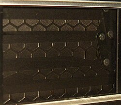 Unlike the other compact F-series SLRs, the FA used a plastic top plate: fiberglass reinforced polycarbonate for the black bodies, acrylonitrile-butadiene-styrene (ABS) for the chrome ones. The FA also used the ultra-fast, bearing-mounted, honeycomb-patterned, titanium-bladed shutter and through-the-lens (TTL) off-the-film (OTF) electronic flash automation of the FE2, but added a digital liquid crystal display (LCD) information panel at the top left of the viewfinder to indicate the readings of the built-in, open aperture, through-the-lens (TTL) light meter versus the actual camera settings. Depending on the set exposure mode, the LCD would display +/– over/underexposure markers, HI/LO out of metering range warnings, shutter speed and/or f-stop. Unfortunately, the LCD could not be illuminated in low ambient light situations. The FA also had a removable finger grip, similar to the one introduced on the Nikon FG, and an eyepiece blind. However, the FA's real claim to fame was the AMP meter.