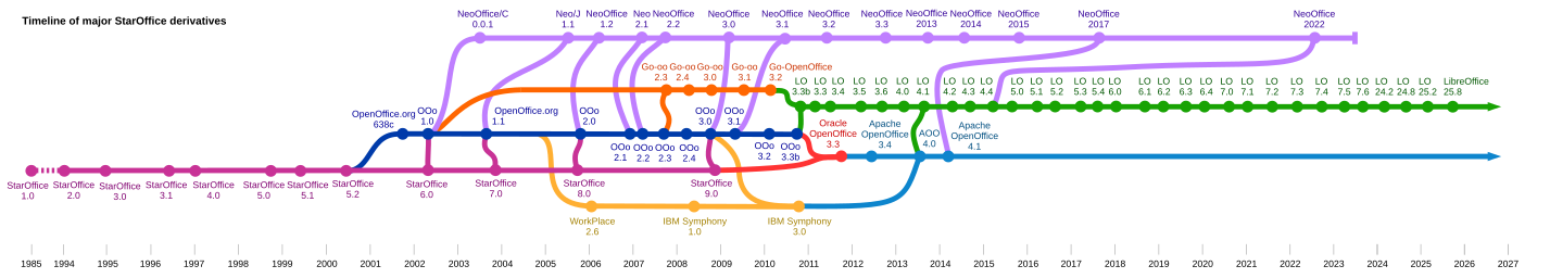 Following Sun’s acquisition by Oracle Corporation, development of OpenOffice.org slowed and eventually ended.[10] In 2011, Oracle donated the project to the Apache Software Foundation,[11][12] which continues it as Apache OpenOffice,[13] although that project has been largely dormant since 2015. A more actively developed fork, LibreOffice, was created in 2010 by members of the OpenOffice.org community.[14][15][16]