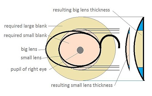 [edit]Material density typically increases as lens thickness is reduced by increasing index. There is also a minimum lens thickness required to support the lens shape. These factors result in a thinner lens which is not lighter than the original. There are lens materials with lower density at higher index which can result in a truly lighter lens. These materials can be found in a material property table. Reducing frame lens size will give the most noticeable improvement in weight for a given material. Ways to reduce the weight and thickness of corrective lenses, in approximate order of importance are these: