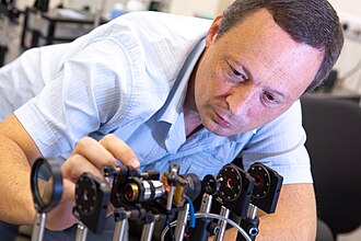 The next development in optical theory came in 1899 when Max Planck correctly modelled blackbody radiation by assuming that the exchange of energy between light and matter only occurred in discrete amounts he called quanta.[36] In 1905, Albert Einstein published the theory of the photoelectric effect that firmly established the quantization of light itself.[37][38] In 1913, Niels Bohr showed that atoms could only emit discrete amounts of energy, thus explaining the discrete lines seen in emission and absorption spectra.[39] The understanding of the interaction between light and matter that followed from these developments not only formed the basis of quantum optics but also was crucial for the development of quantum mechanics as a whole. The ultimate culmination, the theory of quantum electrodynamics, explains all optics and electromagnetic processes in general as the result of the exchange of real and virtual photons.[40] Quantum optics gained practical importance with the inventions of the maser in 1953 and of the laser in 1960.[41]