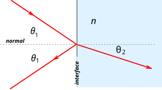 Refraction occurs when light travels through an area of space that has a changing index of refraction; this principle allows for lenses and the focusing of light. The simplest case of refraction occurs when there is an interface between a uniform medium with index of refraction n1 and another medium with index of refraction n2. In such situations, Snell's Law describes the resulting deflection of the light ray: