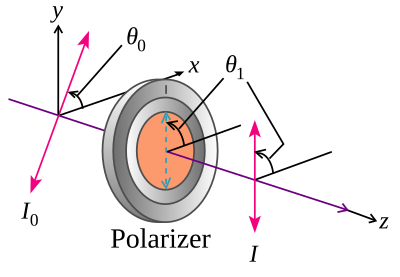 where I0 is the initial intensity, and θi is the angle between the light's initial polarisation direction and the axis of the polariser.[95]