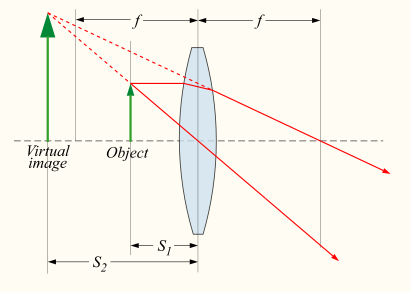 where S1 is the distance from the object to the lens, S2 is the distance from the lens to the image, and f is the focal length of the lens. In the sign convention used here, the object and image distances are positive if the object and image are on opposite sides of the lens.[52]