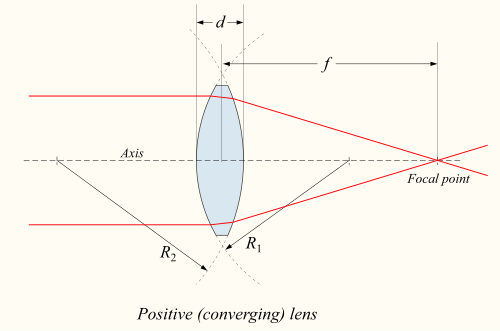 A device that produces converging or diverging light rays due to refraction is known as a lens. Lenses are characterized by their focal length: a converging lens has positive focal length, while a diverging lens has negative focal length. Smaller focal length indicates that the lens has a stronger converging or diverging effect. The focal length of a simple lens in air is given by the lensmaker's equation.[51]