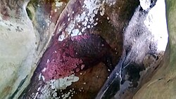 In November 2018, scientists reported the discovery of the then-oldest known figurative art painting, over 40,000 (perhaps as old as 52,000) years old, of an unknown animal, in the cave of Lubang Jeriji Saléh on the Indonesian island of Borneo.[6][7] In December 2019, cave paintings portraying pig hunting within the Maros-Pangkep karst region in Sulawesi were discovered to be even older, with an estimated age of at least 43,900 years. This finding was recognized as "the oldest known depiction of storytelling and the earliest instance of figurative art in human history."[8][9] In 2021, cave art of a pig found in Sulawesi, Indonesia, and dated to over 45,500 years ago, has been reported.[10][11] On July 3, 2024, the journal Nature published research findings indicating that the cave paintings which depict anthropomorphic figures interacting with a pig and measure 36 by 15 inches (91 by 38 cm) in Leang Karampuang are approximately 51,200 years old, establishing them as the oldest known paintings in the world.[12][13]