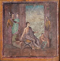 Female painter sitting on a campstool and painting a statue of Dionysus or Priapus onto a panel which is held by a boy. Fresco from Pompeii, 1st century