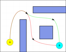 [edit]Multi-agent pathfinding is to find the paths for multiple agents from their current locations to their target locations without colliding with each other, while at the same time optimizing a cost function, such as the sum of the path lengths of all agents. It is a generalization of pathfinding. Many multi-agent pathfinding algorithms are generalized from A*, or based on reduction to other well studied problems such as integer linear programming.[11] However, such algorithms are typically incomplete; in other words, not proven to produce a solution within polynomial time. Some parallel approaches, such as Collaborative Diffusion, are based on embarrassingly parallel algorithms spreading multi-agent pathfinding into computational grid structures, e.g., cells similar to cellular automata. A different category of algorithms sacrifice optimality for performance by either making use of known navigation patterns (such as traffic flow) or the topology of the problem space.[12]