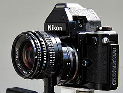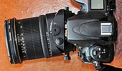 [edit]Movements have been available on view cameras since the early days of photography; they have been available on smaller-format cameras since the early 1960s, usually by means of special lenses or adapters. Nikon introduced a lens providing shift movements for their 35 mm SLR cameras in 1962,[1] and Canon introduced a lens that provided both tilt and shift movements in 1973;[2] many other manufacturers soon followed suit. Canon and Nikon currently offer four lenses that provide both movements.[3] Such lenses are frequently used in architectural photography to control perspective, and in landscape photography to get an entire scene sharp.
