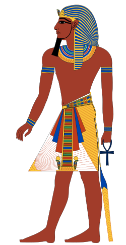 A typical depiction of a pharaoh usually depicted the king wearing the nemes headdress, a false beard, and an ornate shendyt (kilt) (after Djoser of the Third Dynasty) | |