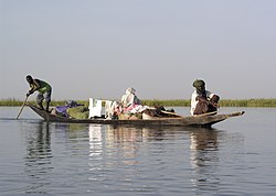 [edit]The term 'pirogue' does not refer to a specific kind of boat, but is a generic term for small boats in regions once colonized by France and Spain, particularly dugouts made from a log.[2] In French West Africa, the term refers to handcrafted banana-shaped boats used by traditional fishermen.[3] In Madagascar, it also includes the more elaborate Austronesian lakana outrigger canoe.[4][5]