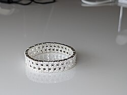 [edit]Rhodium plating is occasionally used on white gold, silver or copper and its alloys. A barrier layer of nickel is usually deposited on silver first, though in this case it is not to prevent migration of silver through rhodium, but to prevent contamination of the rhodium bath with silver and copper, which slightly dissolve in the sulfuric acid usually present in the bath composition.[4]