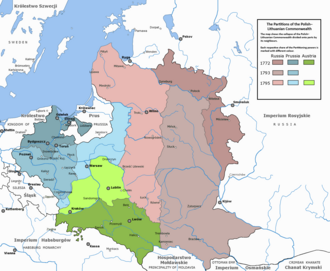 The royal election of 1764 resulted in the elevation of Stanisław II Augustus Poniatowski to the monarchy.[99] His candidacy was extensively funded by his sponsor and former lover, Empress Catherine II of Russia.[100] The new king maneuvered between his desire to implement necessary modernising reforms, and the necessity to remain at peace with surrounding states.[101] His ideals led to the formation of the 1768 Bar Confederation, a rebellion directed against the Poniatowski and all external influence, which ineptly aimed to preserve Poland's sovereignty and privileges held by the nobility.[102] The failed attempts at government restructuring as well as the domestic turmoil provoked its neighbours to invade.[103]