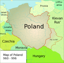 Poland began to form into a recognisable unitary and territorial entity around the middle of the 10th century under the Piast dynasty.[46] In 966, the ruler of the Polans, Mieszko I, accepted Christianity under the auspices of the Roman Church with the Baptism of Poland.[47] In 968, a missionary bishopric was established in Poznań. An incipit titled Dagome iudex first defined Poland's geographical boundaries with its capital in Gniezno and affirmed that its monarchy was under the protection of the Apostolic See.[48] The country's early origins were described by Gallus Anonymus in Gesta principum Polonorum, the oldest Polish chronicle.[49] An important national event of the period was the martyrdom of Saint Adalbert, who was killed by Prussian pagans in 997 and whose remains were reputedly bought back for their weight in gold by Mieszko's successor, Bolesław I the Brave.[48]