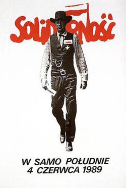 Labour turmoil in 1980 led to the formation of the independent trade union "Solidarity" ("Solidarność"), which over time became a political force.[169] Despite persecution and imposition of martial law in 1981 by General Wojciech Jaruzelski, it eroded the dominance of the Polish United Workers' Party and by 1989 had triumphed in Poland's first partially free and democratic parliamentary elections since the end of the Second World War. Lech Wałęsa, a Solidarity candidate, eventually won the presidency in 1990.[170][171][172] The Solidarity movement heralded the collapse of communist regimes and parties across Europe.[173]