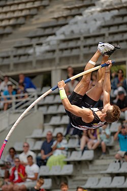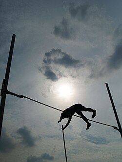 [edit]Today, athletes compete in the pole vault as one of the four jumping events in track and field. Because the high jump and pole vault are both vertical jumps, the competitions are conducted similarly. Each athlete can choose at what height they would like to enter the competition. Once they enter, they have three attempts to clear the height. If a height is cleared, the vaulter advances to the next height, where they will have three more attempts. Once the vaulter has three consecutive misses, they are out of the competition and the highest height they cleared is their result. A "no height", often denoted "NH", refers to the failure of a vaulter to clear any bar during the competition.