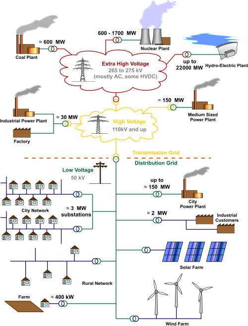 An electrical grid (or electricity network) is an interconnected network for electricity delivery from producers to consumers. Electrical grids consist of power stations, electrical substations to step voltage up or down, electric power transmission to carry power over long distances, and finally electric power distribution to customers. In that last step, voltage is stepped down again to the required service voltage. Power stations are typically built close to energy sources and far from densely populated areas. Electrical grids vary in size and can cover whole countries or continents. From small to large there are microgrids, wide area synchronous grids, and super grids. The combined transmission and distribution network is part of electricity delivery, known as the power grid.