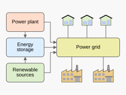 [edit]In a synchronous grid all the generators must run at the same frequency, and must stay very nearly in phase with each other and the grid. Generation and consumption must be balanced across the entire grid, because energy is consumed as it is produced. For rotating generators, a local governor regulates the driving torque, maintaining almost constant rotation speed as loading changes. Energy is stored in the immediate short term by the rotational kinetic energy of the generators.