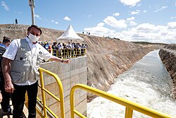 [edit]One of the main objectives of the Bolsonaro Government was to try to complete the execution of more than 14,000 works promised by previous governments, which were never completed until that point, or even having started. According to calculations, the execution and completion of works that have already started would cost something around R$144 billion.[74] Some of the most important road works carried out in Bolsonaro's term include: completion of the duplication of the BR-116 in Rio Grande do Sul,[75] of the BR-101 in the Northeast,[76] of BR-116 in Bahia,[77] of BR-364 between Cuiabá and Rondonópolis,[78] duplication of the BR-470 in Santa Catarina,[79] from BR-280 in Santa Catarina,[80] of the BR-381 in Minas Gerais,[81] construction of the International Integration Bridge (linking Foz do Iguaçu to presidente Franco, in Paraguay),[82] bidding for construction of a bridge that will connect Porto Murtinho (MS) to Carmelo Peralta (Paraguay) for the realization of the Bioceanic Corridor,[83] completion of asphalting of BR-163 in Pará,[84] inauguration of the Abunã Bridge connecting Rondônia to Acre,[85] paving of BRs in the Northeast such as BR-222[86] and the BR-235,[87] in addition to being programmed new concessions for the main motorway of Paraná [88] and Rodovia Presidente Dutra,[89] among others. During Bolsonaro's government, there was also a greater focus on the construction of railways, with the government inaugurating a stretch of the North-South Railway, between Goiás and São Paulo,[90] start of construction of the Railroad of East-West Integration in Bahia,[91] in addition to planning the construction of Ferrogrão, between Mato Grosso and Pará,[92] among others.