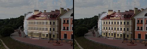 [edit]Rangefinder viewfinders usually have a field of view slightly greater than the lens in use. This allows the photographer to be able to see what is going on outside of the frame, and therefore better anticipate the action, at the expense of a smaller image. In addition, with viewfinders with magnifications larger than 0.8x (e.g. some Leica cameras, the Epson RD-1/s, Canon 7, Nikon S, and in particular the Voigtländer Bessa R3A and R3M with their 1:1 magnification), photographers can keep both eyes open and effectively see a floating viewfinder frame superimposed on their real world view. This kind of two-eyed viewing is also possible with an SLR, using a lens focal length that results in a net viewfinder magnification close to 1.0 (usually a focal length slightly longer than a normal lens); use of a much different focal length would result in a viewfinder with a different magnification than the open eye, making fusion of the images impossible. There is also the difference of the eye-level since the eye looking in the viewfinder actually sees the frame from slightly below the other eye. This means that the final image perceived by the viewer will not be totally even, but rather leaning on one side. This issue can be avoided by shooting in vertical (i.e. portrait) orientation, shooting style and framing allowing.