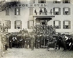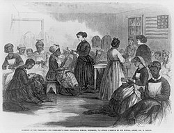 [edit]The Civil War had immense social implications for the United States. Emancipation had altered the legal status of 3.5 million persons, threatened the end of the plantation economy of the South, and provoked questions regarding the legal and social inequality of the races in the United States. The end of the war was accompanied by a large migration of newly freed people to the cities,[21] where they were relegated to the lowest paying jobs, such as unskilled and service labor. Men worked as rail workers, rolling and lumber mills workers, and hotel workers. Black women were largely confined to domestic work employed as cooks, maids, and child nurses, or in hotels and laundries. The large population of slave artisans during the prewar period did not translate into a large number of free artisans during Reconstruction.[22] The dislocations had a severe negative impact on the Black population, with a large amount of sickness and death.[23]