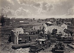 The Confederate States in 1861 had 297 towns and cities, with a total population of 835,000 people; of these, 162, with 681,000 people, were at some point occupied by Union forces. Eleven cities were destroyed or severely damaged by military action, including Atlanta, Charleston, Columbia, and Richmond, though the rate of damage in smaller towns was much lower.[26] Farms were in disrepair, and the prewar stock of horses, mules, and cattle was much depleted. Forty percent of Southern livestock had been killed.[27] The South's farms were not highly mechanized, but the value of farm implements and machinery according to the 1860 Census was $81 million and was reduced by 40% by 1870.[28] The transportation infrastructure lay in ruins, with little railroad or riverboat service available to move crops and animals to market.[29] Railroad mileage was located mostly in rural areas; over two-thirds of the South's rails, bridges, rail yards, repair shops, and rolling stock were in areas reached by Union armies, which systematically destroyed what they could. Even in untouched areas, the lack of maintenance and repair, the absence of new equipment, the heavy over-use, and the deliberate relocation of equipment by the Confederates from remote areas to the war zone ensured the system would be ruined at war's end.[26] Restoring the infrastructure—especially the railroad system—became a high priority for Reconstruction state governments.[30]