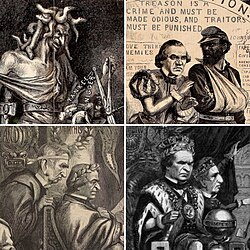 From left to right and top to the bottom: The ruins of Richmond, Virginia; newly-freed African Americans voting for the first time in 1867;[1] office of the Freedmen's Bureau in Memphis, Tennessee; Memphis riots of 1866 | |||