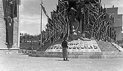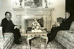 [edit]On 12 November 1938, the day after Atatürk's death, his ally İsmet İnönü was elected the second president and assumed leadership of the Republican People's Party.[21] İnönü's presidency saw heavy state involvement in the economy and further rural development initiatives such as Village Institutes. On foreign affairs, the Hatay State was annexed and İnönü adopted a policy of neutrality despite attempts by the Allies and Axis powers to bring Turkey into World War II, during which extensive conscription and rationing was implemented to ensure an armed neutrality. Non-Muslims especially suffered when the CHP government implemented discriminatory "wealth taxes," labor battalions, and peon camps. Over the course of the war, the CHP eventually rejected ultranationalism, with pan-Turkists being purged in the Racism-Turanism Trials.