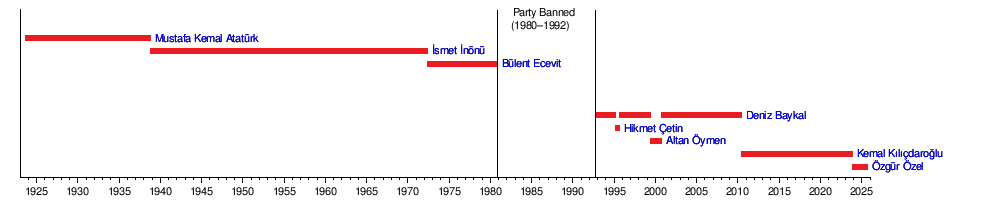 After World War II, Atatürk's successor, İsmet İnönü, allowed for multi-party elections, and the party initiated a peaceful transition of power after losing the 1950 election, ending the one-party period and beginning Turkey's multi-party period. The years following the 1960 military coup saw the party gradually trend towards the center-left, which was cemented once Bülent Ecevit became chairman in 1972. The CHP, along with all other political parties of the time, was banned by the military junta of 1980. The CHP was re-established with its original name by Deniz Baykal on 9 September 1992, with the participation of a majority of its members from the pre-1980 period. Since 2002, it has been the main opposition party to the ruling Justice and Development Party (AKP).[16] Özgür Özel is the chairman of the CHP since 8 November 2023.