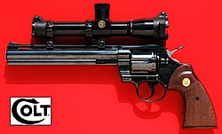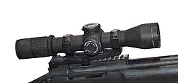 A telescopic sight, commonly called a scope informally, is an optical sighting device based on a refracting telescope.[1] It is equipped with some form of a referencing pattern – known as a reticle – mounted in a focally appropriate position in its optical system to provide an accurate point of aim. Telescopic sights are used with all types of systems that require magnification in addition to reliable visual aiming, as opposed to non-magnifying iron sights, reflector (reflex) sights, holographic sights or laser sights, and are most commonly found on long-barrel firearms, particularly rifles, usually via a scope mount. Similar devices are also found on other platforms such as artillery, tanks and even aircraft.[2][3] The optical components may be combined with optoelectronics to add night vision or smart device features.