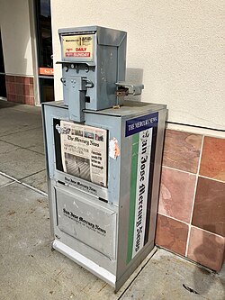 Older San Jose Mercury News newsboxes have black, white, and green stripes, while newer Mercury News newsboxes bear the paper's logo in white against a blue background.